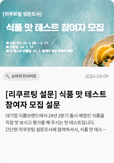 • 프로젝트에 참여하는 패널들은 소비자로서 정확하고 진실된 정보를 전달하며, 특별한 경험을 통해 브랜드의 경쟁력을 높이고 성장을 돕는다는 사명감을 가지고 있습니다.